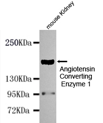 Western blot detection of Angiotensin Converting Enzyme 1 in Mouse kidney cell lysates using Angiotensin Converting Enzyme 1 mouse mAb (1:1000 diluted).Predicted band size:150KDa.Observed band size:190KDa. |