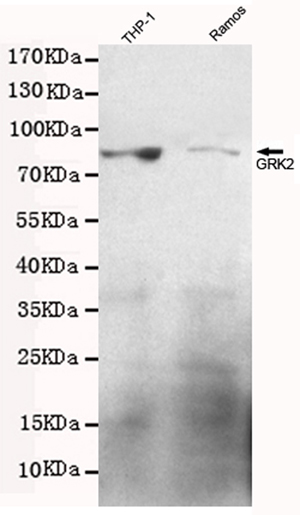 Western blot detection of GRK2 in Ramos and THP-1 cell lysates using GRK2 mouse mAb (1:500 diluted),with super ECL.Predicted band size:80KDa.Observed band size:80KDa.Exposure time:20S. |