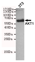 Western blot detection of AKT1 in 3T3 cell lysates using AKT1 mouse mAb (dilution 1:2000),with super ECL.Predicted band size:60KDa.Observed band size:60KDa. |