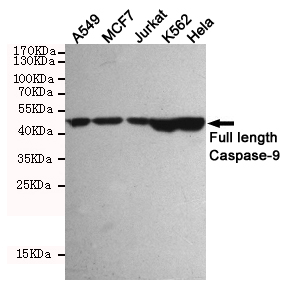 Western blot detection of Caspase-9 in A549,MCF7,Jurkat,K562 and Hela cell lysates using Caspase-9 mouse mAb (1:1000 diluted).Predicted band size:49/37KDa.Observed band size:49KDa. |