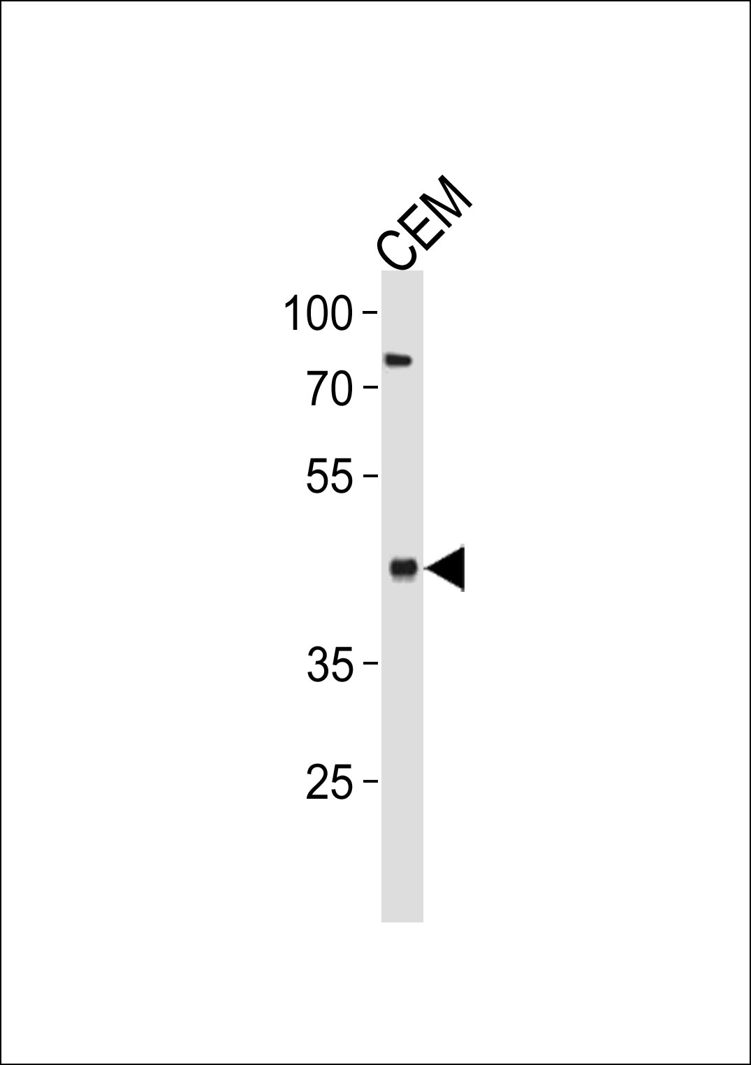 FADS2 Antibody (Center) (Cat. AMM04502G) western blot analysis in CEM cell line lysates (35ug/lane).This demonstrates the FADS2 antibody detected the FADS2 protein (arrow).