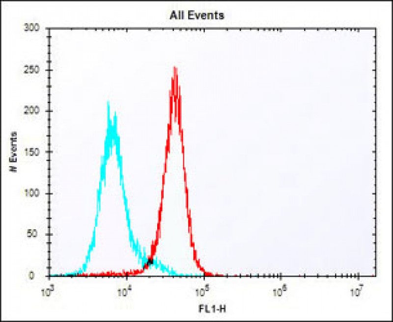 Overlay histogram showing K562 cells stained with APR09991G (red line). The cells were fixed with 2% paraformaldehyde (10 min) and then permeabilized with 90% methanol for 10 min. The cells were then icubated in 2% bovine serum albumin to block non-specific protein-protein interactions followed by the antibody (APR09991G, 1:25 dilution) for 60 min at 37?C. The secondary antibody used was Alexa Fluor? 488 goat anti-rabbit lgG (H+L) (1583138) at 1/400 dilution for 40 min at 37?C. Isotype control antibody (blue line) was rabbit IgG1 (1μg/1x10^6 cells) used under the same conditions. Acquisition of >10, 000 events was performed.