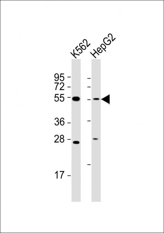 All lanes : Anti-SLC10A1 Antibody (C-term) at 1:2000 dilution Lane 1: K562 whole cell lysates Lane 2: HepG2 whole cell lysates Lysates/proteins at 20 μg per lane. Secondary Goat Anti-Rabbit IgG, (H+L), Peroxidase conjugated at 1/10000 dilution Predicted band size : 38 kDa Blocking/Dilution buffer: 5% NFDM/TBST.