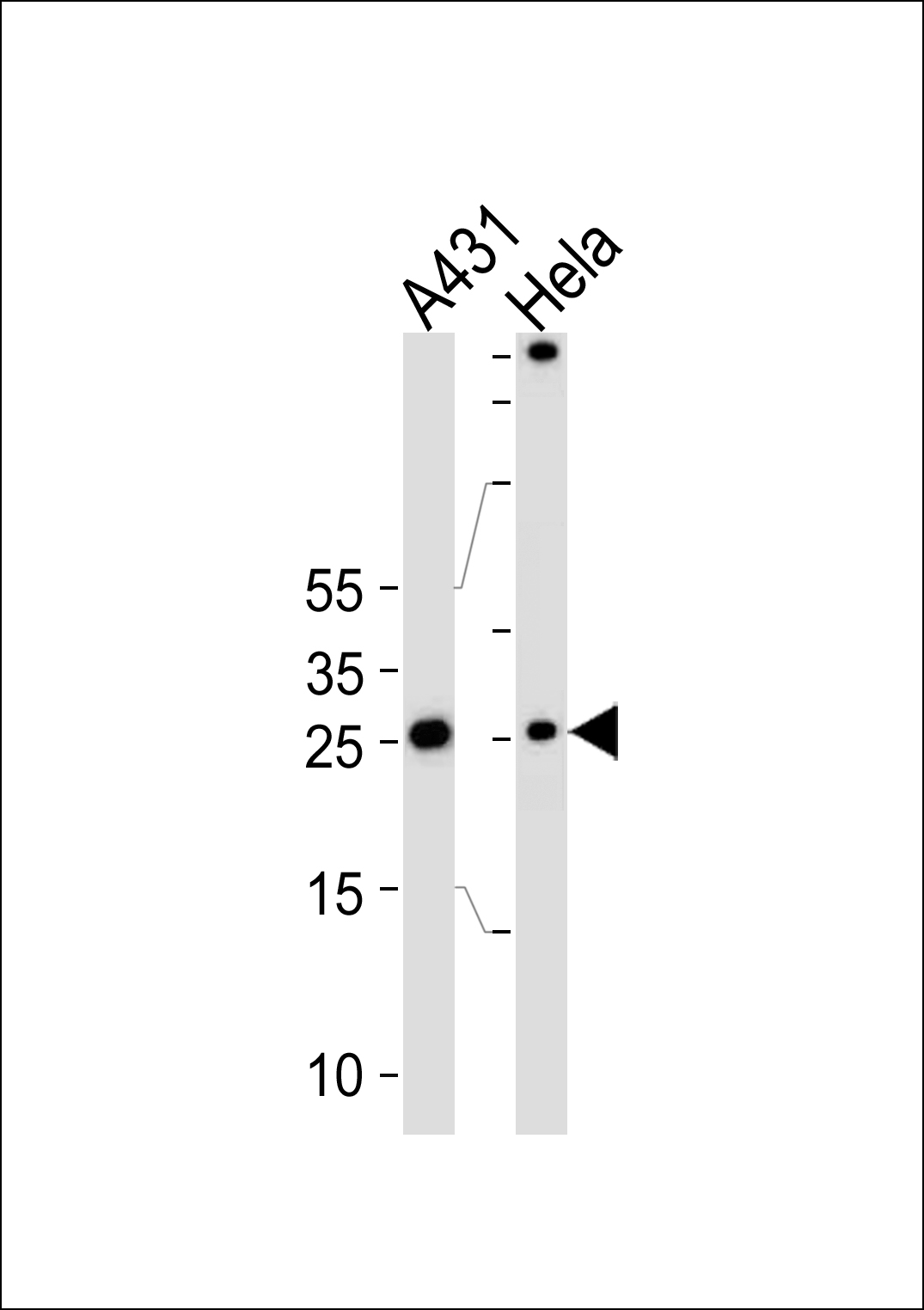 Western blot analysis of lysates from A431, Hela cell line (from left to right), using SFN Antibody (C-term) ( APR13300G). APR13300G was diluted at 1:1000 at each lane. A goat anti-rabbit IgG H&L(HRP) at 1:5000 dilution was used as the secondary antibody. Lysates at 35ug per lane.