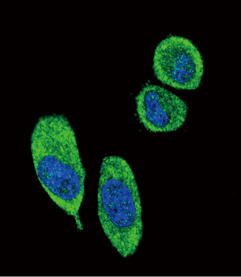 Confocal immunofluorescent analysis of SFN Antibody (C-term)(Cat. APR13300G) with A549 cell followed by Alexa Fluor搴?488-conjugated goat anti-rabbit lgG (green). DAPI was used to stain the cell nuclear (blue). |