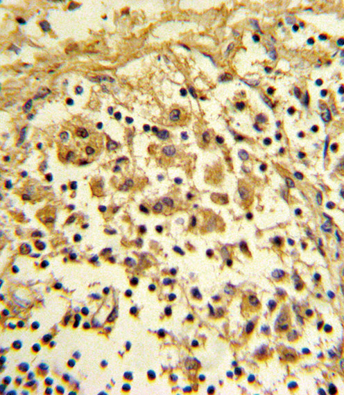 Formalin-fixed and paraffin-embedded human lymph reacted with ENO1 Antibody (Center), which was peroxidase-conjugated to the secondary antibody, followed by DAB staining. This data demonstrates the use of this antibody for immunohistochemistry; clinical relevance has not been evaluated.