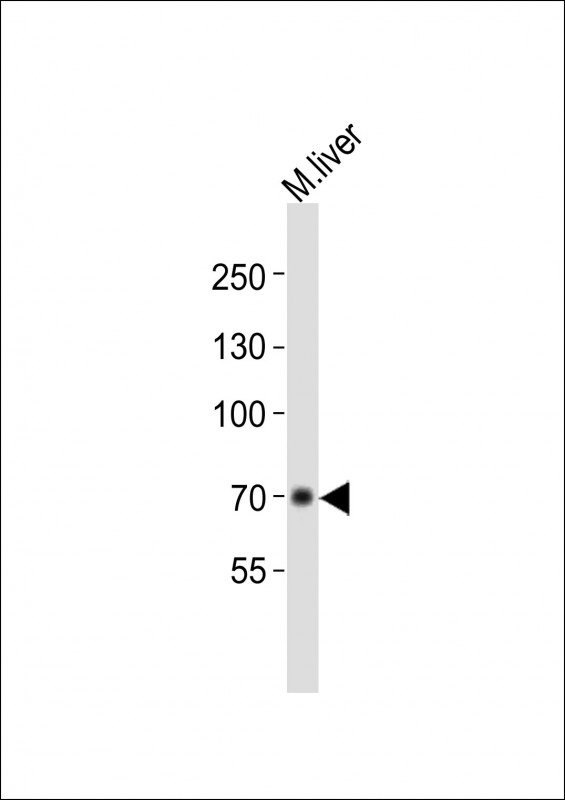 Anti-ALB Antibody (C-term)at 1:1000 dilution + mouse liver lysates Lysates/proteins at 20 μg per lane. Secondary Goat Anti-Rabbit IgG, (H+L), Peroxidase conjugated at 1/10000 dilution Predicted band size : 70 kDa Blocking/Dilution buffer: 5% NFDM/TBST.