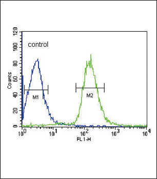 ALB Antibody (C-term) (Cat. APR07055G) flow cytometric analysis of HepG2 cells (right histogram) compared to a negative control cell (left histogram).FITC-conjugated goat-anti-rabbit secondary antibodies were used for the analysis. |
