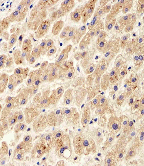 Immunohistochemical analysis of paraffin-embedded H. liver section using PDIA6 Antibody (Center K159)( AMM07078G). AMM07078G was diluted at 1:100 dilution. A peroxidase-conjugated goat anti-rabbit IgG at 1:400 dilution was used as the secondary antibody, followed by DAB staining.