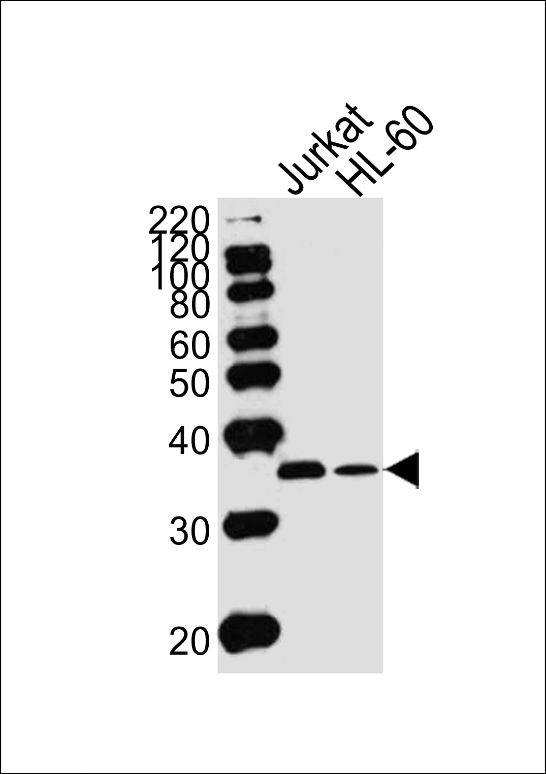 Western blot analysis of lysates from Jurkat, HL-60 cell line (from left to right), using TYSY Antibody (C-term)( APR07199G). APR07199G was diluted at 1:1000 at each lane. A goat anti-rabbit IgG H&L(HRP) at 1:5000 dilution was used as the secondary antibody. Lysates at 35ug per lane.