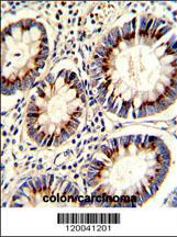 Formalin-fixed and paraffin-embedded human colon carcinoma with TYSY Antibody (C-term), which was peroxidase-conjugated to the secondary antibody, followed by DAB staining. This data demonstrates the use of this antibody for immunohistochemistry; clinical relevance has not been evaluated. |