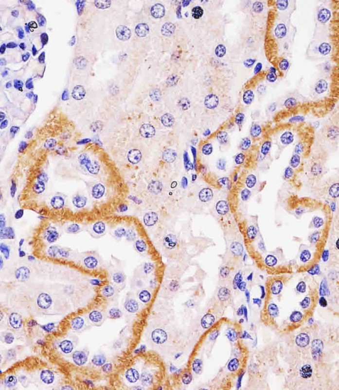 AP6698B staining TTR in Rat kidney tissue sections by Immunohistochemistry (IHC-P - paraformaldehyde-fixed, paraffin-embedded sections). Tissue was fixed with formaldehyde and blocked with 3% BSA for 0. 5 hour at room temperature; antigen retrieval was by heat mediation with a citrate buffer (pH6). Samples were incubated with primary antibody (1/25) for 1 hours at 37°C. A undiluted biotinylated goat polyvalent antibody wasused as the secondary antibody.