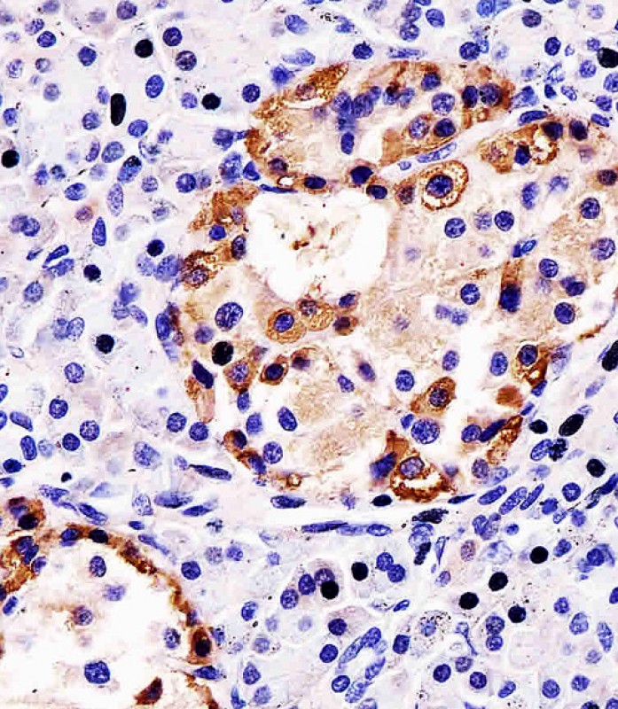 AP6698B staining TTR in human pancreas tissue sections by Immunohistochemistry (IHC-P - paraformaldehyde-fixed, paraffin-embedded sections). Tissue was fixed with formaldehyde and blocked with 3% BSA for 0. 5 hour at room temperature; antigen retrieval was by heat mediation with a citrate buffer (pH6). Samples were incubated with primary antibody (1/25) for 1 hours at 37°C. A undiluted biotinylated goat polyvalent antibody was used as the secondary antibody.
