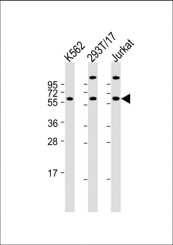 All lanes : Anti-Hsp 60 Antibody (N-term) at 1:2000 dilution Lane 1: K562 whole cell lysate Lane 2: 293T/17 whole cell lysate Lane 3: Jurkat whole cell lysate Lysates/proteins at 20 μg per lane. Secondary Goat Anti-Rabbit IgG, (H+L), Peroxidase conjugated at 1/10000 dilution. Predicted band size : 55 kDa Blocking/Dilution buffer: 5% NFDM/TBST.