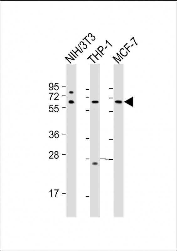 All lanes : Anti-RELA Antibody (N-term) at 1:2000 dilution Lane 1: NIH/3T3 whole cell lysate Lane 2: THP-1 whole cell lysate Lane 3: MCF-7 whole cell lysate Lysates/proteins at 20 μg per lane. Secondary Goat Anti-Rabbit IgG, (H+L), Peroxidase conjugated at 1/10000 dilution. Predicted band size : 60 kDa Blocking/Dilution buffer: 5% NFDM/TBST.
