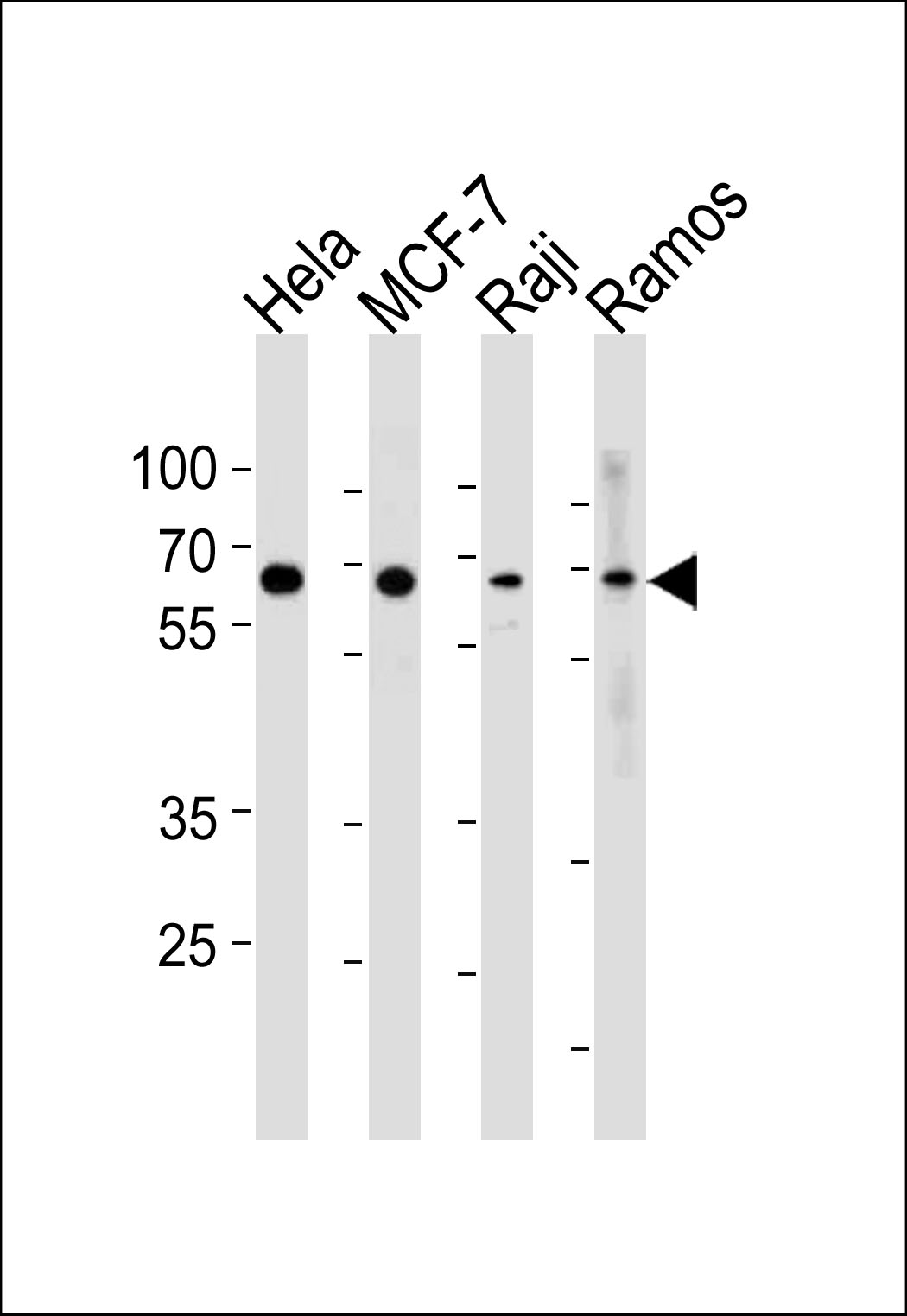 RELA Antibody (N-term) (Cat. AMR09721G) western blot analysis in Hela,MCF-7,Raji,Ramos cell line lysates (35ug/lane).This demonstrates the RELA antibody detected the RELA protein (arrow).