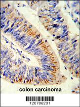Formalin-fixed and paraffin-embedded human colon carcinoma reacted with RELA Antibody (N-term), which was peroxidase-conjugated to the secondary antibody, followed by DAB staining. This data demonstrates the use of this antibody for immunohistochemistry; clinical relevance has not been evaluated. |