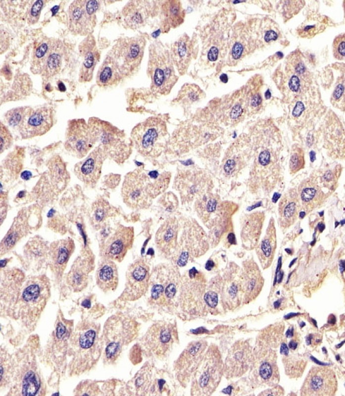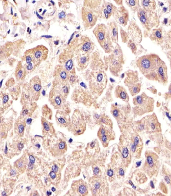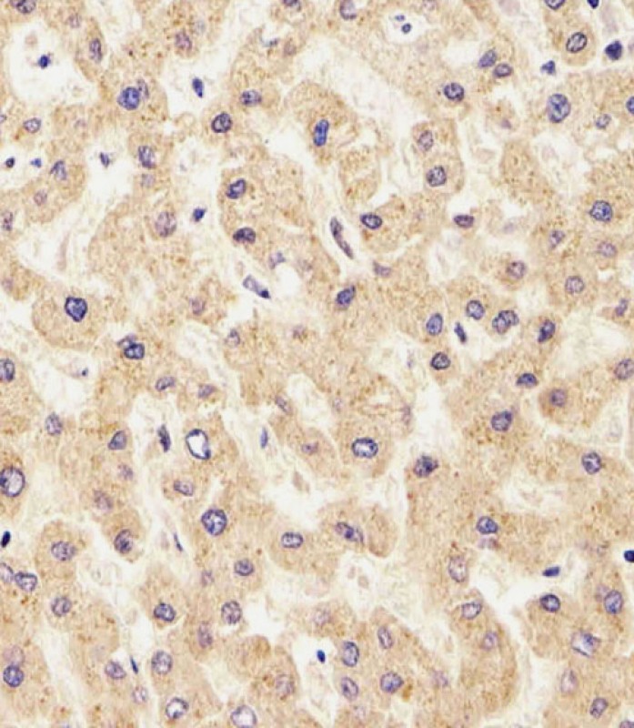 APR12042G staining GLUL in Human liver tissue sections by Immunohistochemistry (IHC-P - paraformaldehyde-fixed, paraffin-embedded sections). Tissue was fixed with formaldehyde and blocked with 3% BSA for 0. 5 hour at room temperature; antigen retrieval was by heat mediation with a citrate buffer (pH6). Samples were incubated with primary antibody (1/25) for 1 hours at 37°C. A undiluted biotinylated goat polyvalent antibody was used as the secondary antibody. |