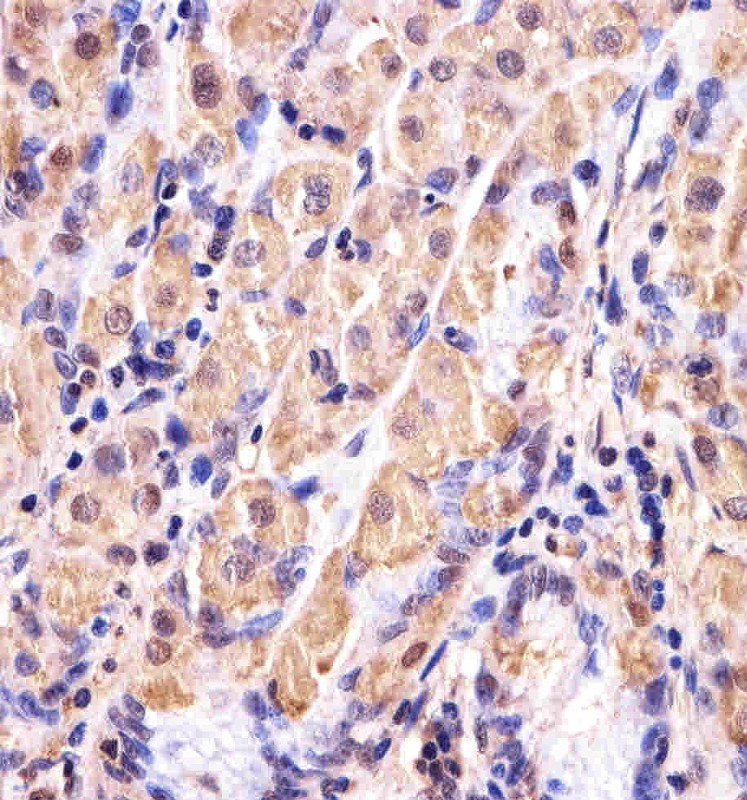 Immunohistochemical analysis of paraffin-embedded H. stomach section using GSS Antibody (C-term)( AMM05226G). AMM05226G was diluted at 1:25 dilution. A undiluted biotinylated goat polyvalent antibody was used as the secondary, followed by DAB staining.