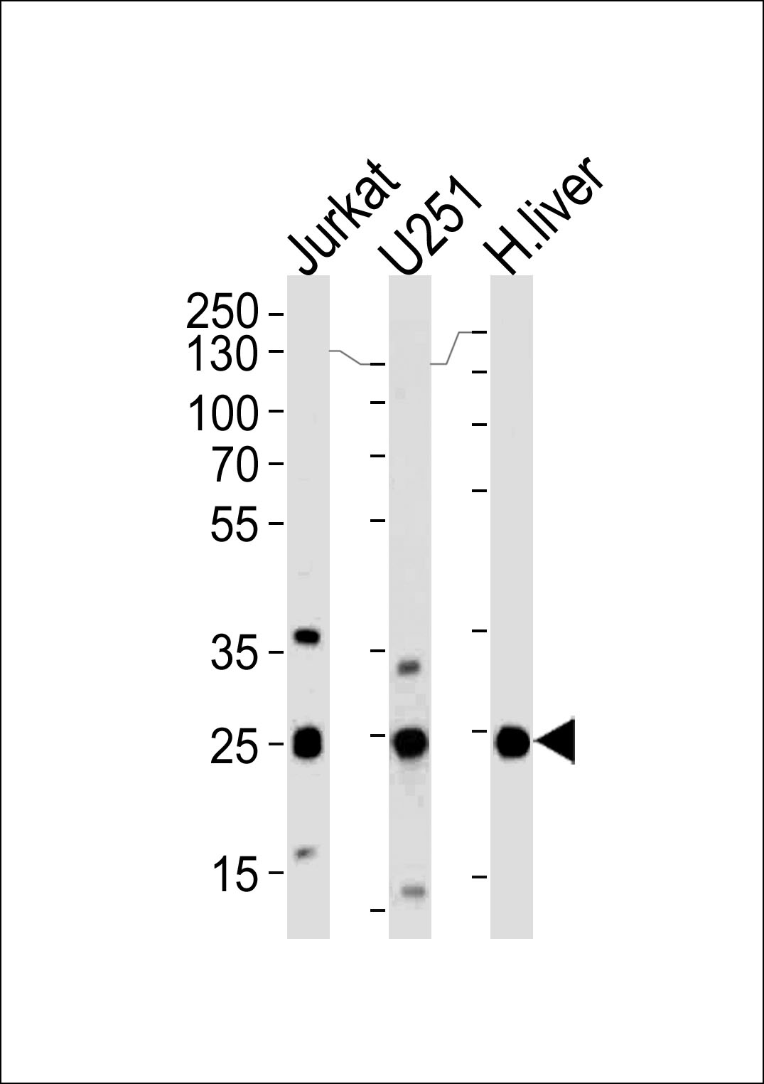 Western blot analysis of lysates from Jurkat, U251 cell line and human liver tissue (from left to right), using GSTM1 Antibody (C-term) (Cat. AMM05246G). AMM05246G was diluted at 1:1000 at each lane. A goat anti-rabbit (HRP) at 1:5000 dilution was used as the secondary antibody. Lysates at 35ug per lane.