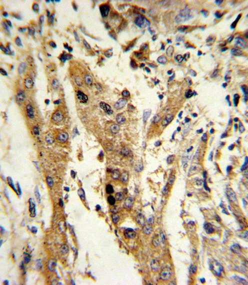 Formalin-fixed and paraffin-embedded human hepatocarcinoma reacted with GSTM1 Antibody (C-term), which was peroxidase-conjugated to the secondary antibody, followed by DAB staining. This data demonstrates the use of this antibody for immunohistochemistry; clinical relevance has not been evaluated.