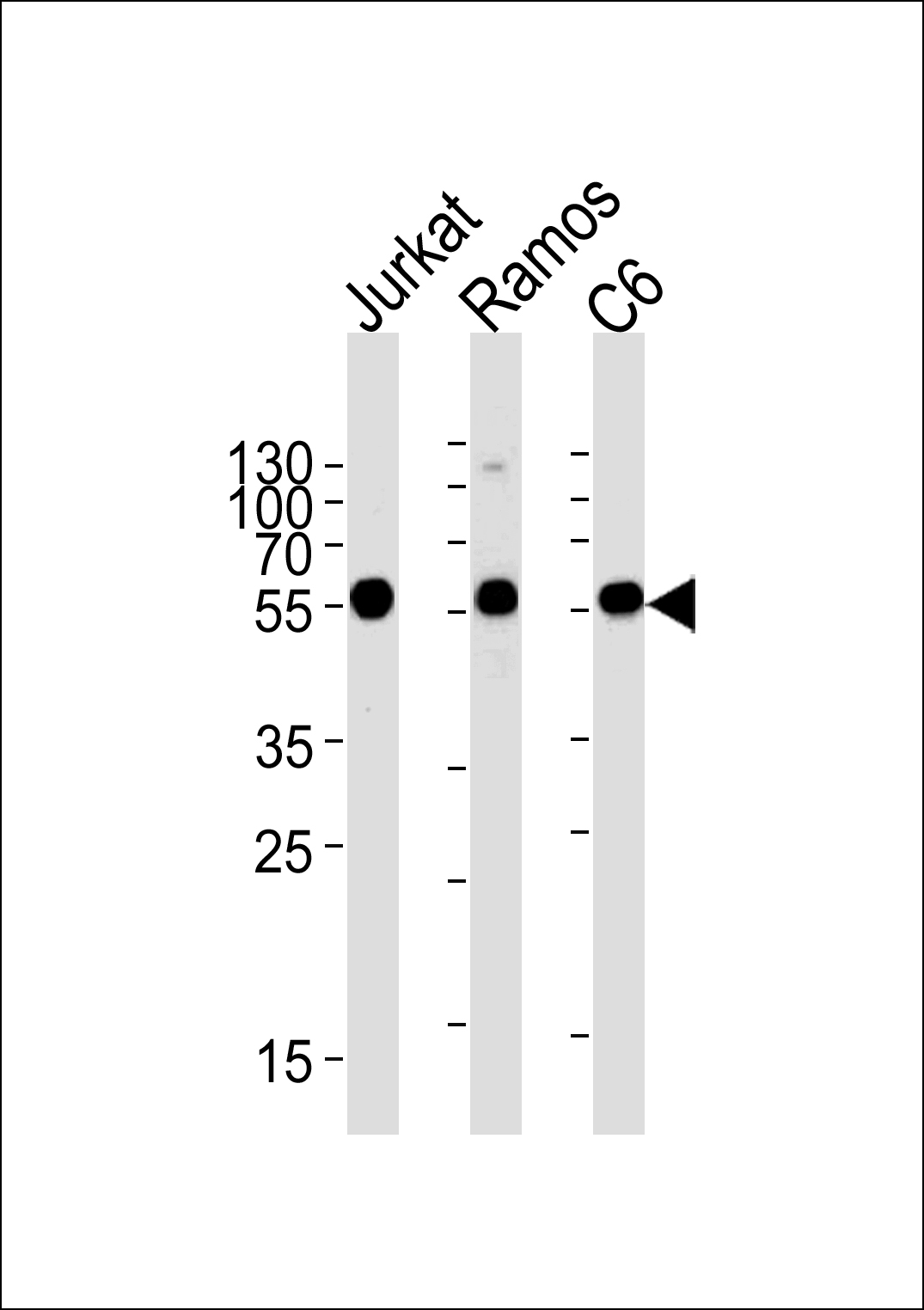 CALR Antibody (Center) (Cat. APR15233G) western blot analysis in Jurkat,Ramos,rat C6 cell line lysates (35ug/lane).This demonstrates the CALR antibody detected the CALR protein (arrow).