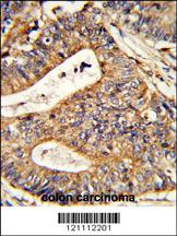 Formalin-fixed and paraffin-embedded human colon carcinoma reacted with CALR Antibody (Center), which was peroxidase-conjugated to the secondary antibody, followed by DAB staining. This data demonstrates the use of this antibody for immunohistochemistry; clinical relevance has not been evaluated. |