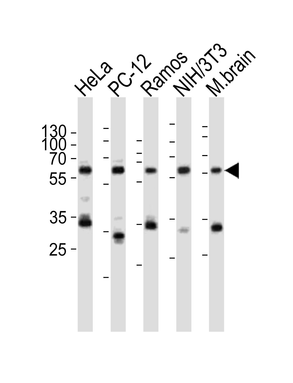 Western blot analysis of lysates from HeLa, rat PC-12, Ramos, mouse NIH/3T3 cell line, mouse brain tissue lysate(from left to right), using PKM2-N491( APR07169G). APR07169G was diluted at 1:1000 at each lane. A goat anti-rabbit IgG H&L(HRP) at 1:10000 dilution was used as the secondary antibody. Lysates at 20ug per lane.