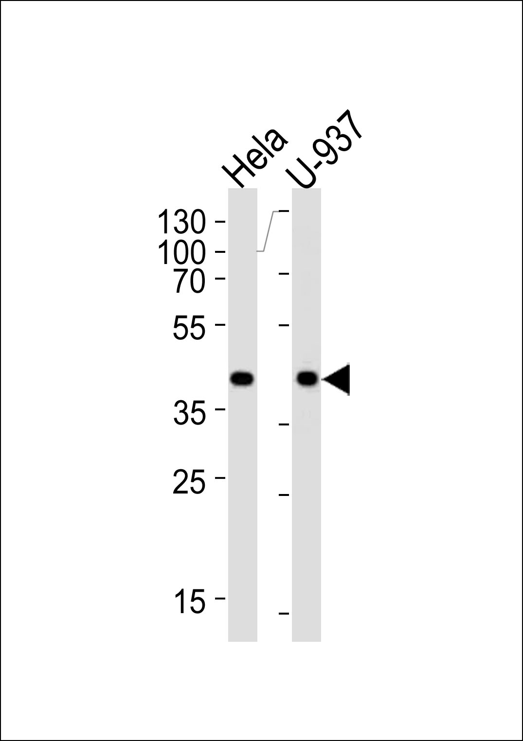 Western blot analysis of lysates from Hela, U-937 cell line (from left to right), using PGK1 Antibody (G132)( AMM04370G). AMM04370G was diluted at 1:1000 at each lane. A goat anti-rabbit IgG H&L(HRP) at 1:5000 dilution was used as the secondary antibody. Lysates at 35ug per lane.