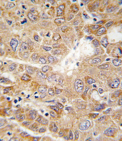 Formalin-fixed and paraffin-embedded human hepatocarcinoma tissue reacted with PGK1 antibody (Center), which was peroxidase-conjugated to the secondary antibody, followed by DAB staining. This data demonstrates the use of this antibody for immunohistochemistry; clinical relevance has not been evaluated. |
