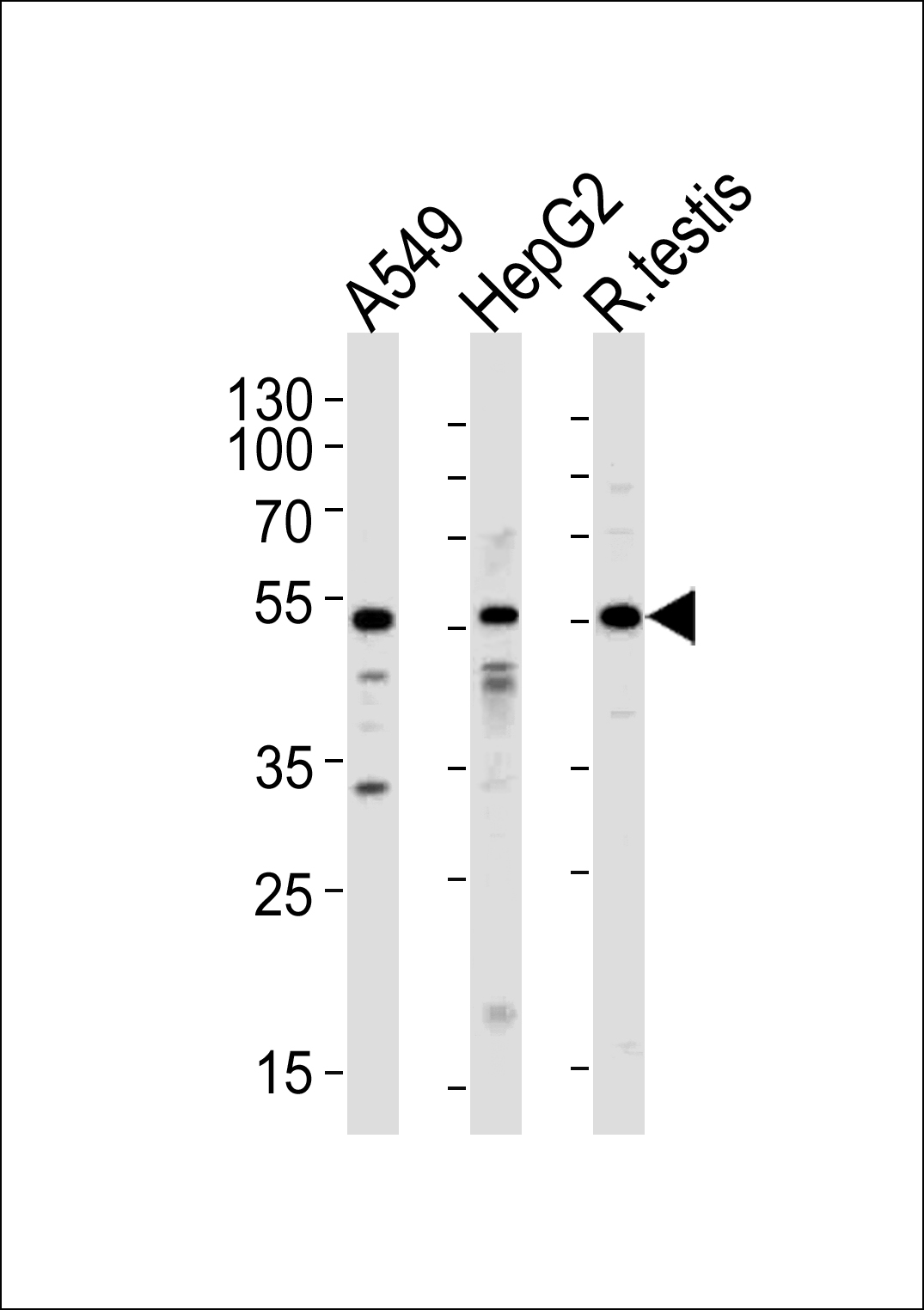 Western blot analysis of lysates from A549,HepG2 cell line and rat testis tissue (from left to right),using ACVR1 Antibody (N-term)(Cat. APR14786G).APR14786G was diluted at 1:1000 at each lane. A goat anti-rabbit IgG H&L(HRP) at 1:5000 dilution was used as the secondary antibody.Lysates at 35ug per lane.