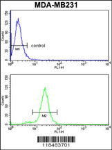 SERPINA3 Antibody (C-term) (Cat. APR13264G) flow cytometry analysis of MDA-MB231 cells (bottom histogram) compared to a negative control cell (top histogram). FITC-conjugated goat-anti-rabbit secondary antibodies were used for the analysis. |
