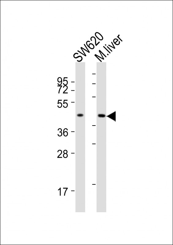All lanes : Anti-ACAT1 Antibody (C-term) at 1:2000 dilution Lane 1: SW620 whole cell lysates Lane 2: mouse liver lysates Lysates/proteins at 20 μg per lane. Secondary Goat Anti-Rabbit IgG, (H+L), Peroxidase conjugated at 1/10000 dilution Predicted band size : 45. 2 kDa Blocking/Dilution buffer: 5% NFDM/TBST.