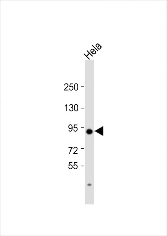 Anti-TGM2 Antibody (Center K444) at 1:1000 dilution + Hela whole cell lysate Lysates/proteins at 20 μg per lane. Secondary Goat Anti-Rabbit IgG, (H+L), Peroxidase conjugated at 1/10000 dilution. Predicted band size : 77 kDa Blocking/Dilution buffer: 5% NFDM/TBST.