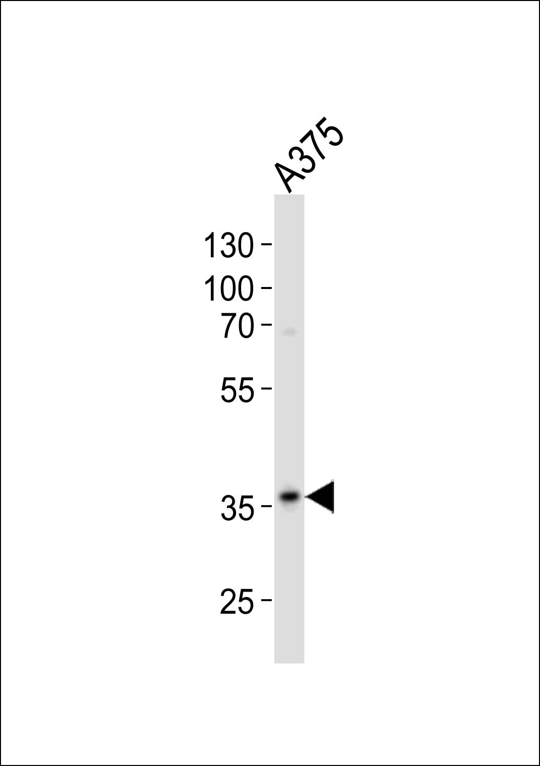 Western blot analysis of lysate from A375 cell line, using GAPDH Antibody (N-term)( AMM04369G). AMM04369G was diluted at 1:500. A goat anti-rabbit IgG H&L(HRP) at 1:10000 dilution was used as the secondary antibody. Lysate at 20ug.
