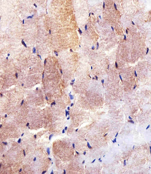 Immunohistochemical analysis of paraffin-embedded H. skeletal muscle section using HK2 (Hexokinase II) Antibody (Center)( APR07762G). APR07762G was diluted at 1:100 dilution. A undiluted biotinylated goat polyvalent antibody was used as the secondary, followed by DAB staining.