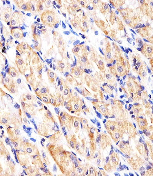 Immunohistochemical analysis of paraffin-embedded H. stomach section using HK2 (Hexokinase II) Antibody (Center)( APR07762G). APR07762G was diluted at 1:100 dilution. A undiluted biotinylated goat polyvalent antibody was used as the secondary, followed by DAB staining.