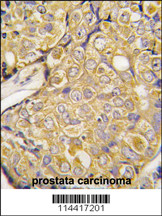 Formalin-fixed and paraffin-embedded human prostata carcinoma tissue reacted with TRPM8 antibody (Center R536) (Cat. APR10554G), which was peroxidase-conjugated to the secondary antibody, followed by DAB staining. This data demonstrates the use of this antibody for immunohistochemistry; clinical relevance has not been evaluated. |