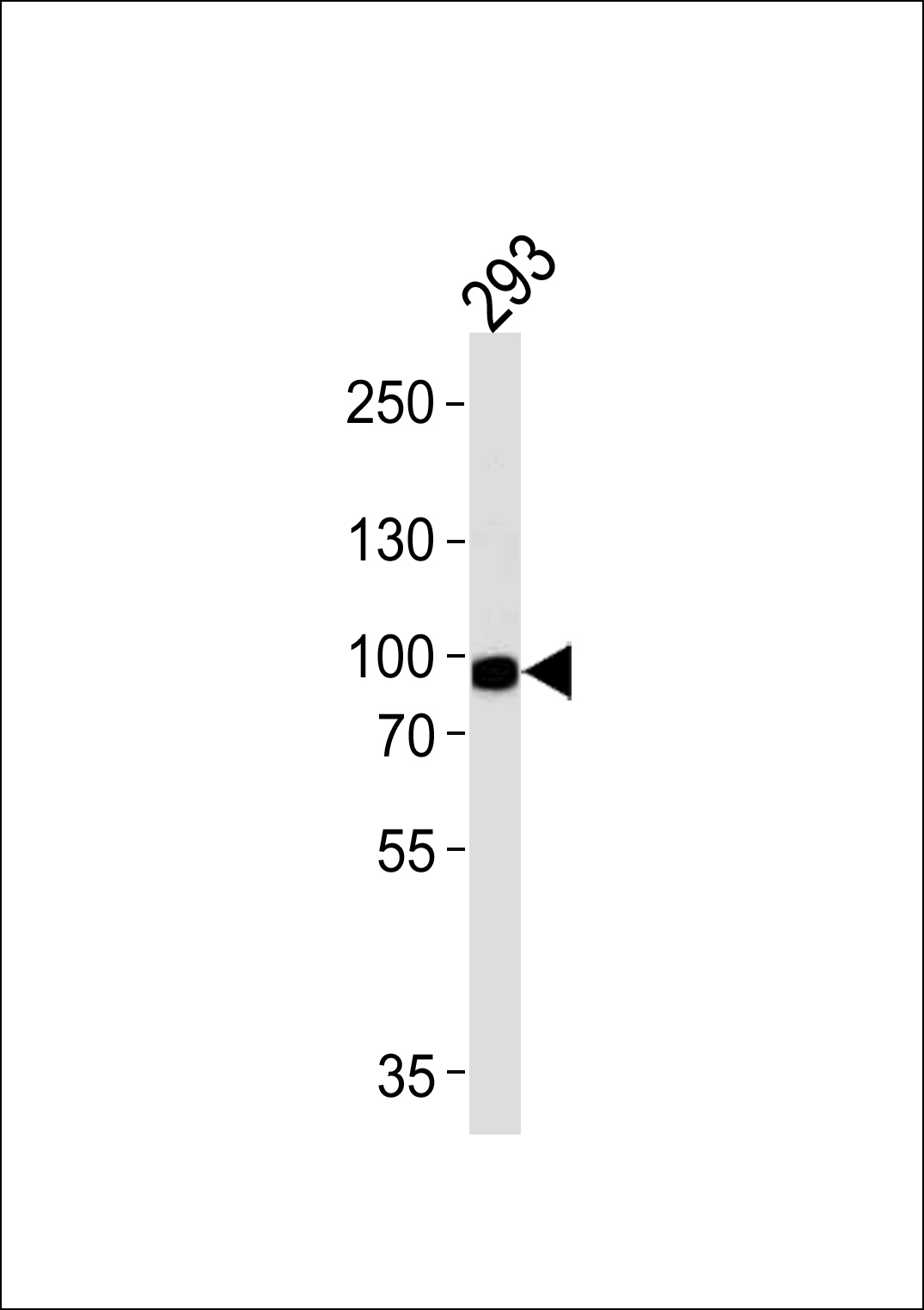 Western blot analysis of lysate from 293 cell line, using PLA2G4A Antibody (Center) ( AMR09333G). AMR09333G was diluted at 1:1000 at each lane. A goat anti-rabbit IgG H&L(HRP) at 1:5000 dilution was used as the secondary antibody. Lysate at 35ug.
