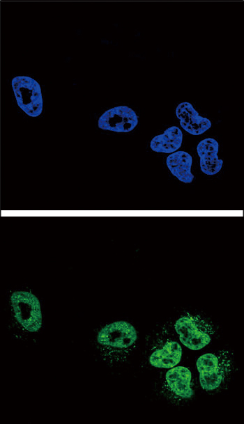 Confocal immunofluorescent analysis of PLA2G4A Antibody (Center)(Cat. AMR09333G) with NCI-H460 cell followed by Alexa Fluor搴?488-conjugated goat anti-rabbit lgG (green). DAPI was used to stain the cell nuclear (blue). |