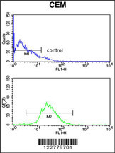 HSPA6 Antibody (C-term) (Cat. APR07833G) flow cytometry analysis of CEM cells (bottom histogram) compared to a negative control cell (top histogram).FITC-conjugated goat-anti-rabbit secondary antibodies were used for the analysis. |