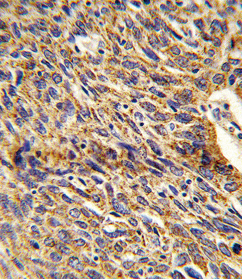 Formalin-fixed and paraffin-embedded human lung carcinoma reacted with DCI Antibody (C-term), which was peroxidase-conjugated to the secondary antibody, followed by DAB staining. This data demonstrates the use of this antibody for immunohistochemistry; clinical relevance has not been evaluated. |