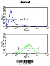 C1QB Antibody (N-term) (Cat. AMM05652G) flow cytometry analysis of Jurkat cells (bottom histogram) compared to a negative control cell (top histogram).FITC-conjugated goat-anti-rabbit secondary antibodies were used for the analysis. |