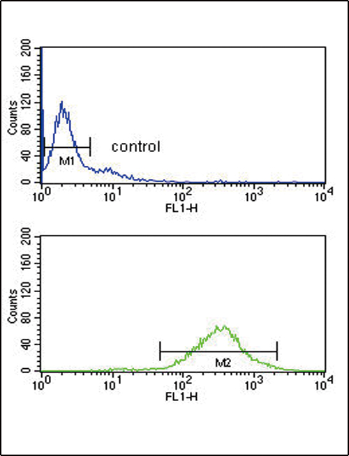 GOT2 Antibody (N-term) (Cat. AMM05172G) flow cytometry analysis of Ramos cells (bottom histogram) compared to a negative control cell (top histogram).FITC-conjugated goat-anti-rabbit secondary antibodies were used for the analysis. |