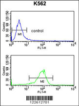 ATP1B2 Antibody (Center) (Cat. APG02087G) flow cytometry analysis of K562 cells (bottom histogram) compared to a negative control cell (top histogram).FITC-conjugated goat-anti-rabbit secondary antibodies were used for the analysis. |