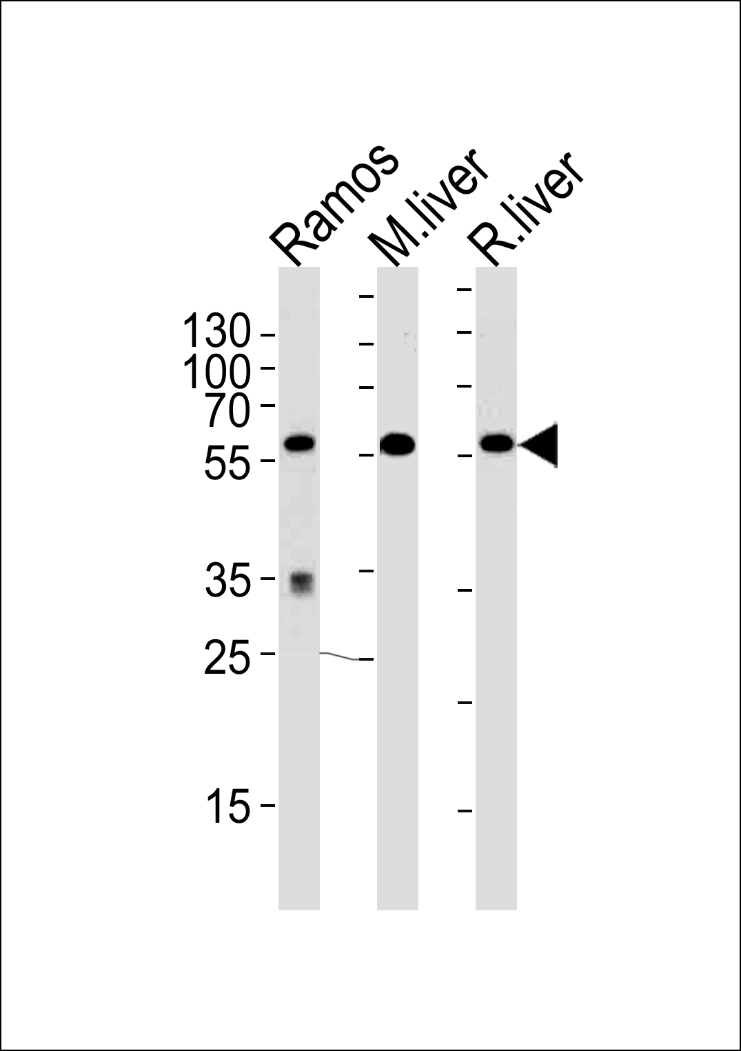 Western blot analysis of lysates from Ramos cell line,mouse liver,rat liver tissue (from left to right),using GPI Antibody (C-term)(Cat. APR07034G).APR07034G was diluted at 1:1000 at each lane. A goat anti-rabbit IgG H&L(HRP) at 1:5000 dilution was used as the secondary antibody.Lysates at 35ug per lane.