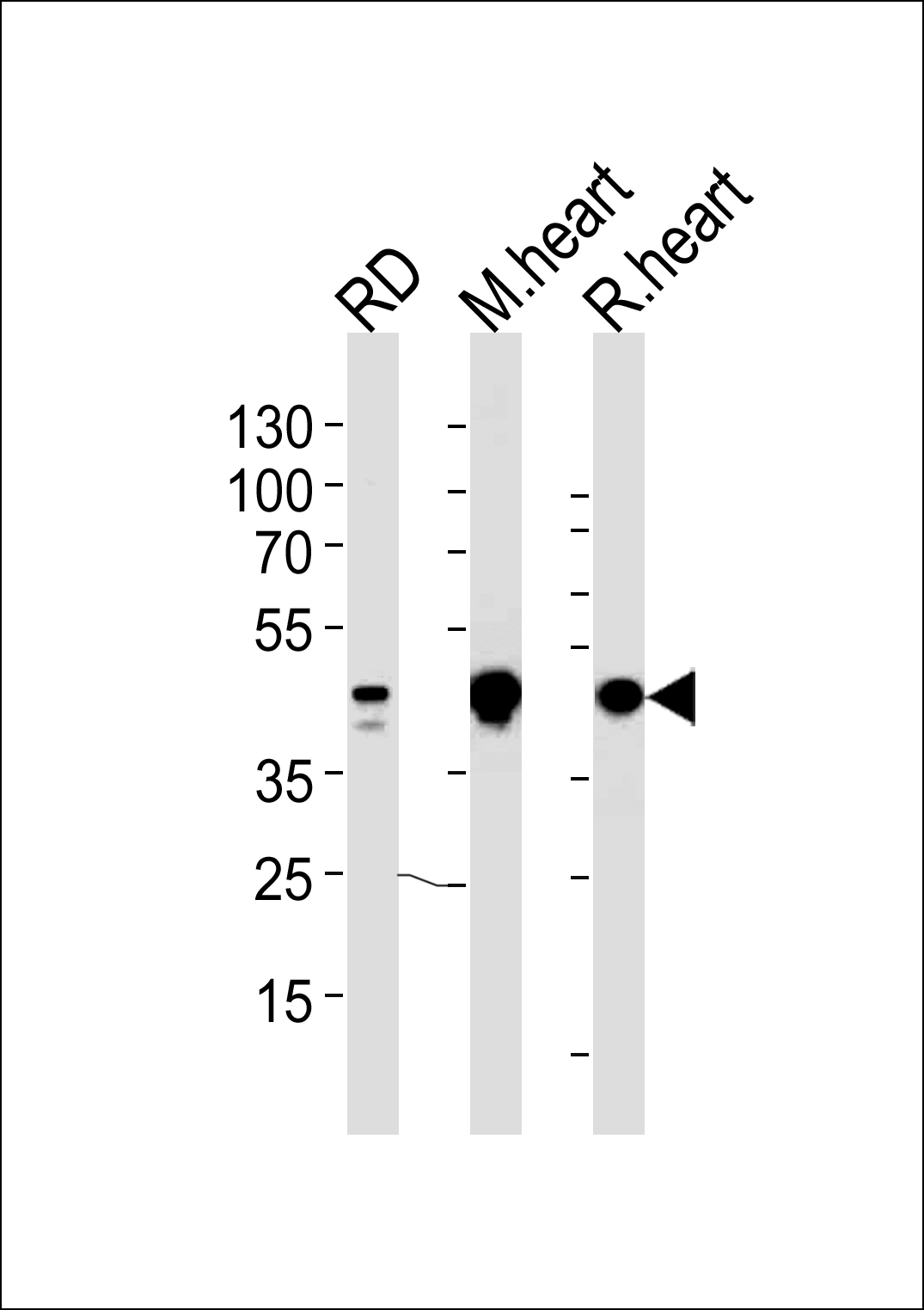 PDK2 Antibody (Cat. APR07005G) western blot analysis in RD cell line and mouse heart,rat heart lysates (35ug/lane).This demonstrates the PDK2 antibody detected the PDK2 protein (arrow).