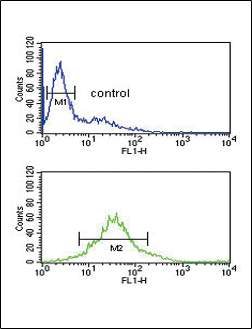PDK2 Antibody (Cat. APR07005G) flow cytometric analysis of Jurkat cells (bottom histogram) compared to a negative control cell (top histogram).FITC-conjugated goat-anti-rabbit secondary antibodies were used for the analysis.