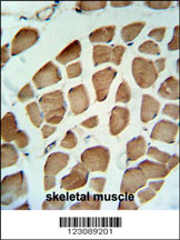 PDK2 Antibody (Cat. APR07005G) IHC analysis in formalin fixed and paraffin embedded skeletal muscle followed by peroxidase conjugation of the secondary antibody and DAB staining. This data demonstrates the use of the PDK2 Antibody for immunohistochemistry. Clinical relevance has not been evaluated. |