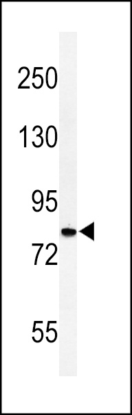 Western blot analysis of CDH20 Antibody (N-term) (Cat. APR15398G) in HepG2 cell line lysates (35ug/lane). CDH20 (arrow) was detected using the purified Pab.